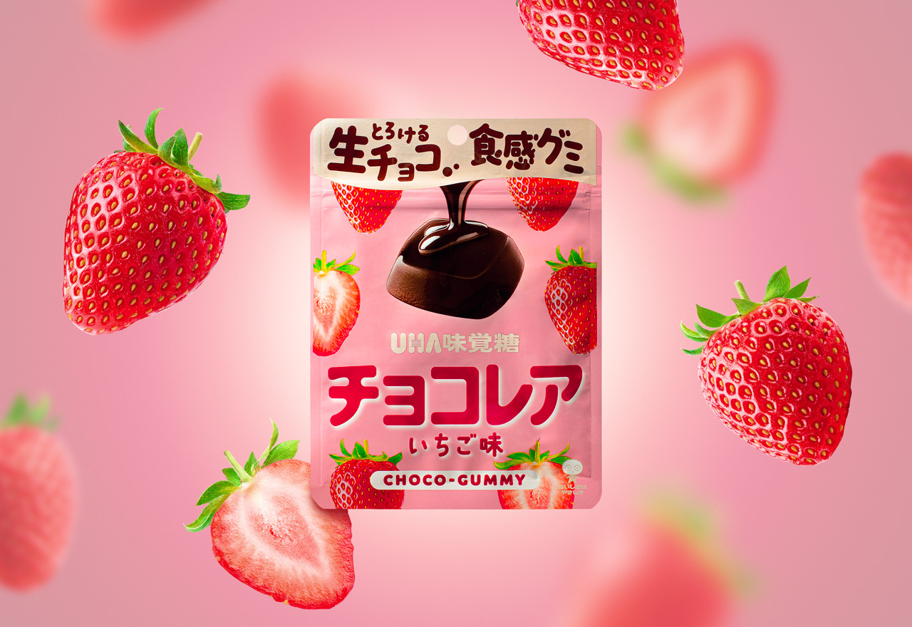 チョコレア いちご味はとろける生チョコのような新食感グミの新フレーバー。”生チョコ食感”をシンボリックに表現するチョコレートを注ぎかけた製品グミのシズルは踏襲して、いちごのフレッシュな味わいを想起させるペールピンクの空間で表現。いちごシズルをパターン化してレイアウトすることで、高級感のある”チョコレア”からポップで可愛らしい”チョコレア いちご味”へとフレーバーを展開しました。