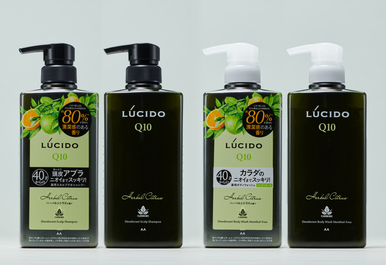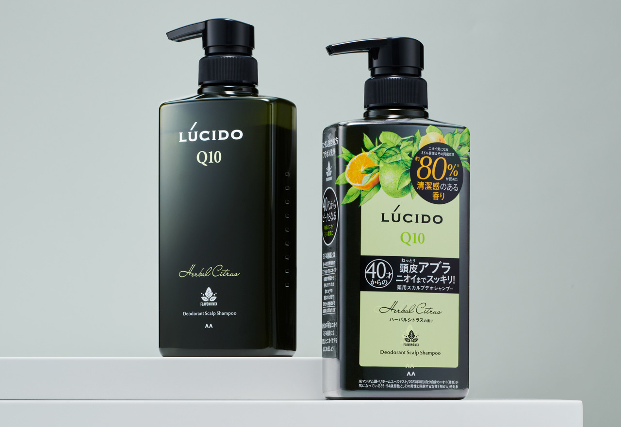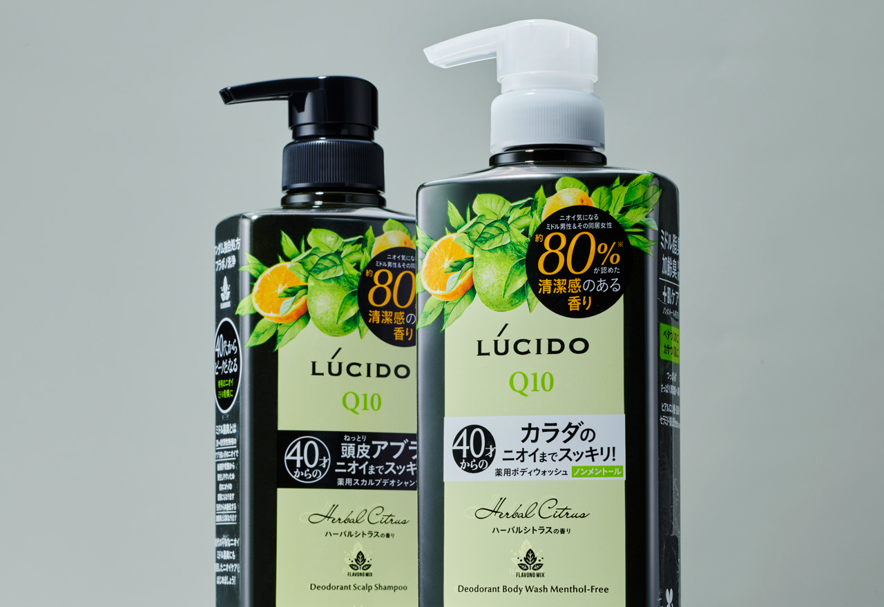 LUCIDO ニオイケアシリーズ ハーバルシトラスはLUCIDOブランド初めてのフレグランスシリーズ。新しいラインのフォーマットとして、パネルデザインにフレグランスを想起させる植物のイラストを上部にあしらってデザインしました。ディープグリーンのクリアボトルは、ハーバルシトラスの香りを象徴する自然的なポジショニングを表しています。既存のデザイン資産を残しながら、新たなイメージで店頭でも映えるデザインです。