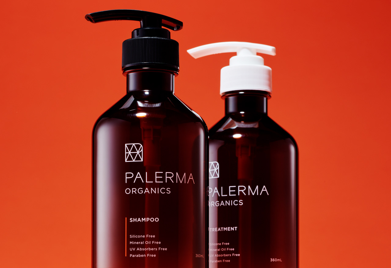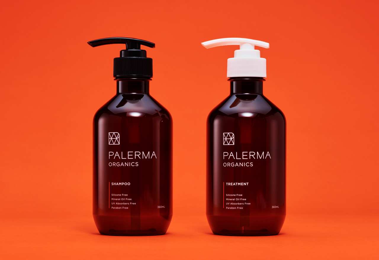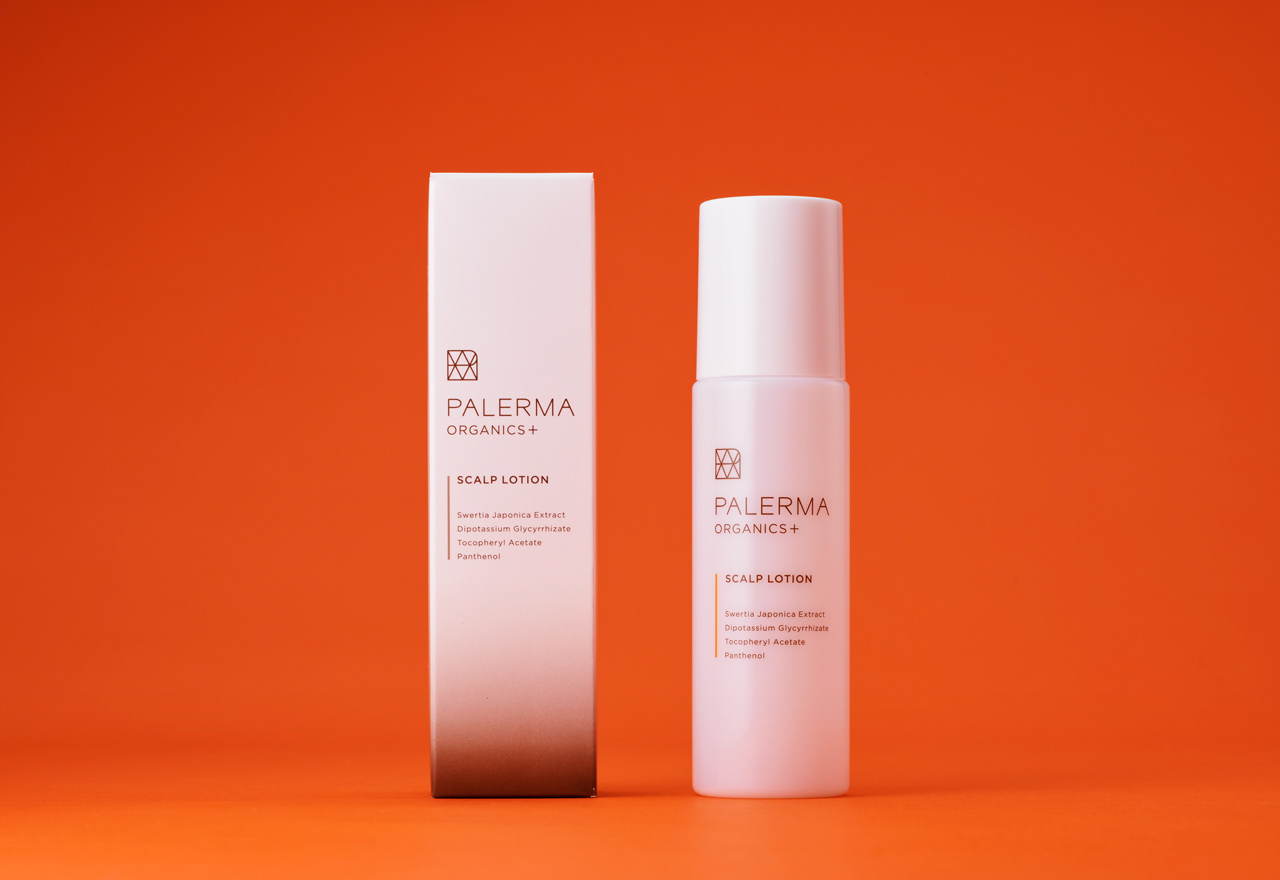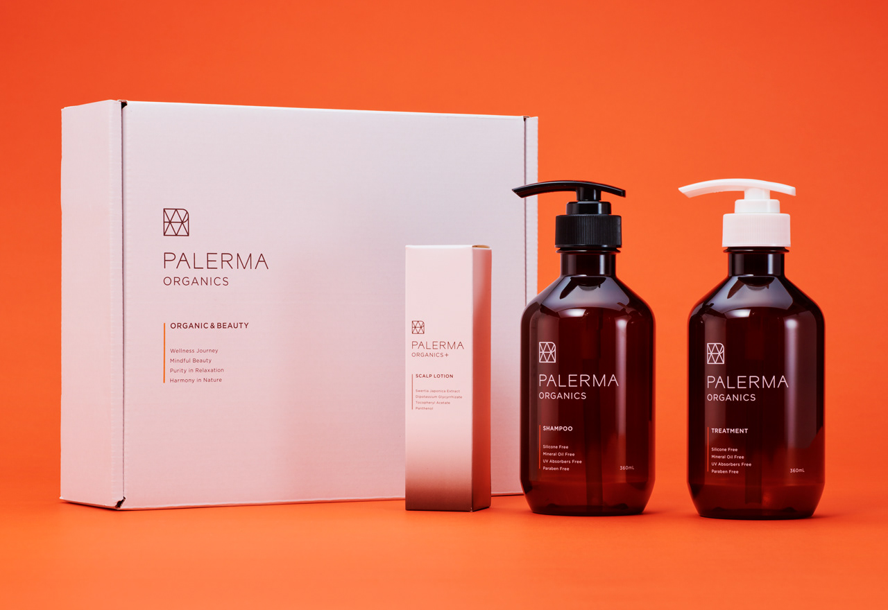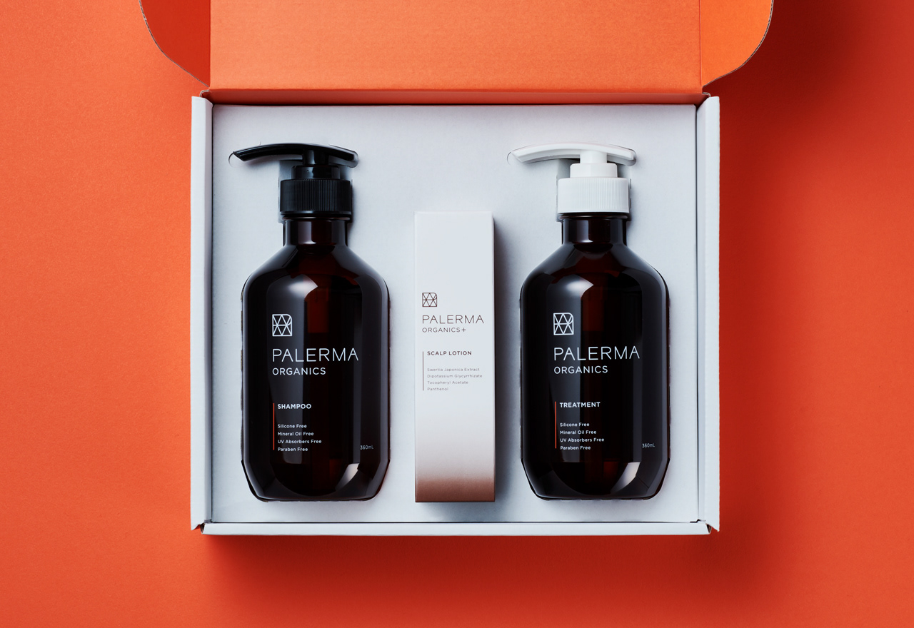 PALERMAは金木犀の香りが特徴のオーガニック処方シャンプー&トリートメント。ご愛用者様向けに既存のアルミパウチパッケージを詰め替えられるボトルパッケージに、新たにスカルプローションも加えてボックスパッケージにリデザインしています。シンプルで無駄がない素材でできている商品設計から、ボックスデザインの外側は無垢なホワイトに。内側は段ボールの表裏で色を変え、蓋を開けるとPALERMAのキーカラーであるオレンジが見えるデザインに。コンセプトをインパクトのある形で伝えられる仕様にしました。ボトルデザインは既存のデザインの資産を残し、シンプルな構成でデザインしています。