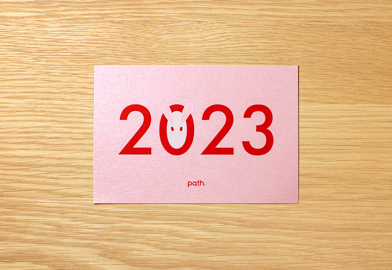 2023年の年賀状。2023のタイポグラフィから干支のうさぎがのぞくデザイン。