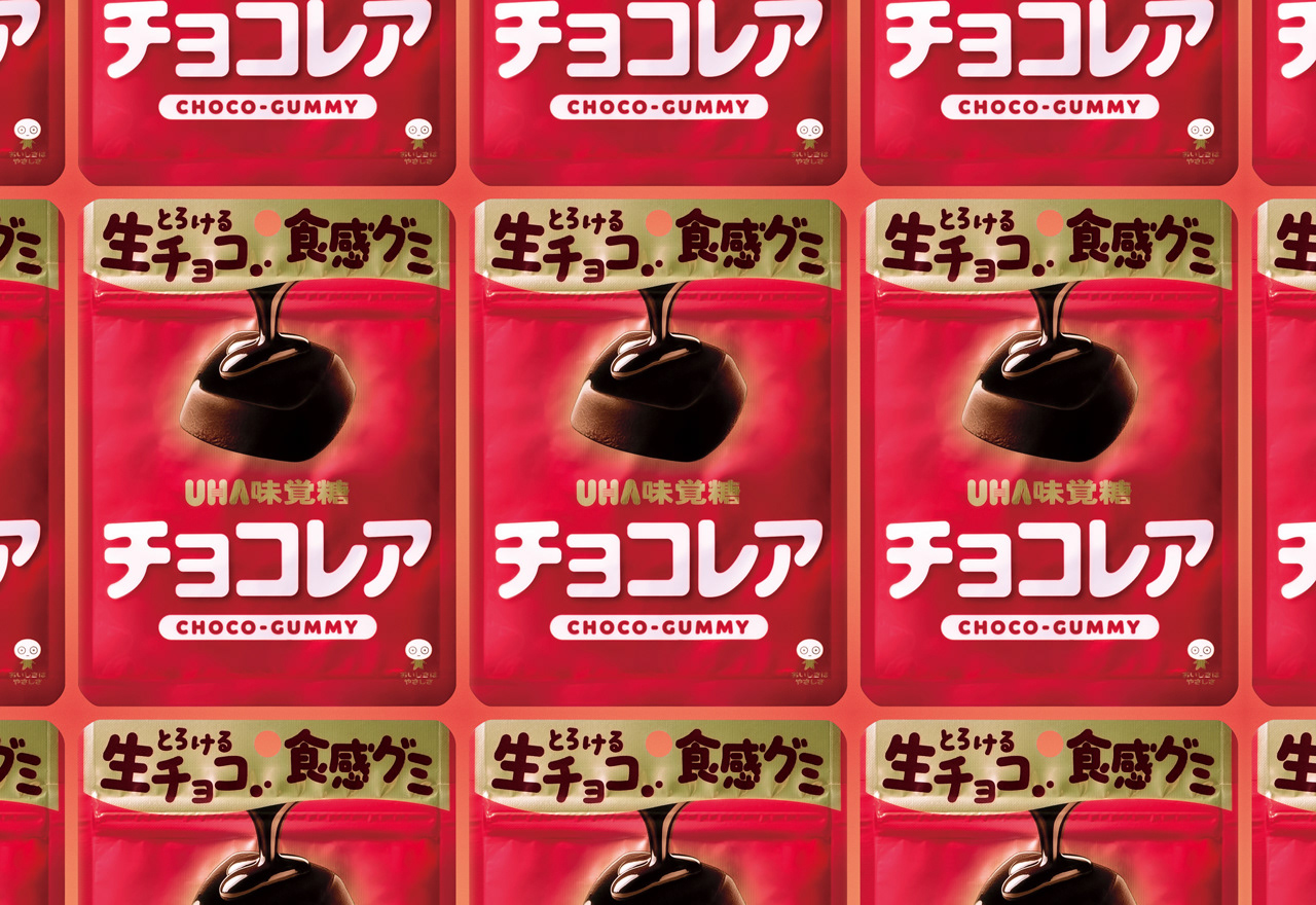 チョコレアはとろける生チョコのような新食感グミ。カカオを想起させる赤い空間をベースに、製品グミに対してチョコレートを注ぎかけたシズルイメージが”生チョコ食感”をシンボリックに表現します。丸みをおびたゴシック体のロゴタイプは、とろける柔らかいイメージやチョコレート菓子ではなくグミである製品の本質も表現しています。パッケージ上部では製品特性を端的にコピーワークで伝達しています。