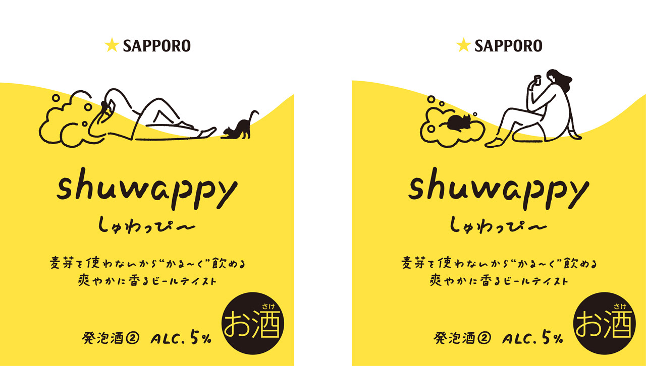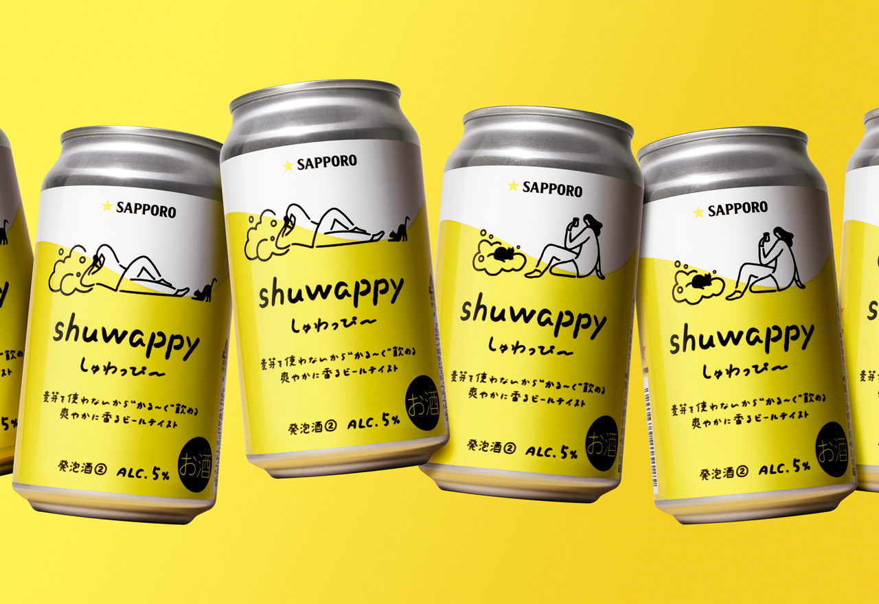 shuwappyは麦芽を使わないかる〜く飲めるビールテイスト飲料です。麦芽を使わないことで抑えられた苦味や渋み、爽やかに香るフレーバーホップによって、気軽に楽しめるライトな爽快感が味わえます。これまでのビールのポジショニングにはなかった肩肘を張らない、ありのままの自分らしいマインドを抜け感のあるユニークなイラストレーションでシンボリックに表現しました。シンプル化したビールシズルとイラストレーションを関わらせることで、心地よいビールテイストの味わいとベネフィットを表現しています。